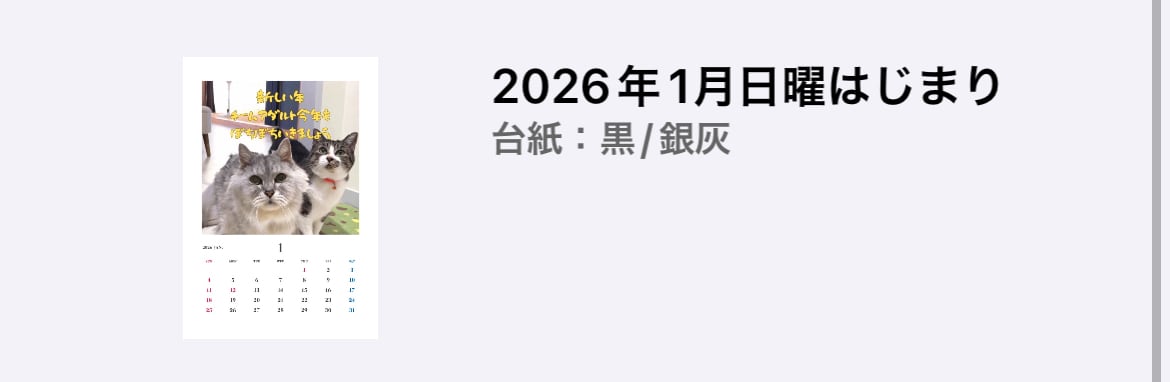 猫ども見て、おかーさんのコメント見て、 一緒に2026年を突っ走ろー!オオー!!! ハガキサイズの置く場所に困らない 縦型省スペース設計のリング綴りタイプ 2ヶ月分両面印刷 コンパクトなので机や玄関やトイレの棚とか ちょっとしたスペースに飾れると思うよ